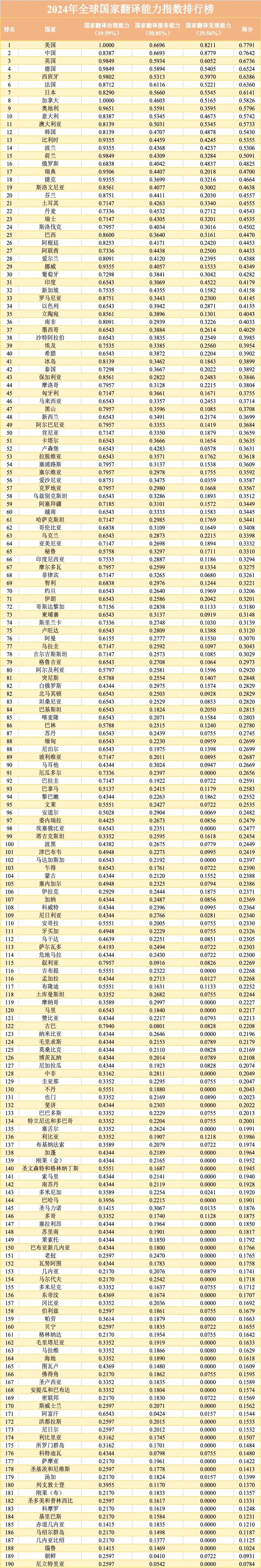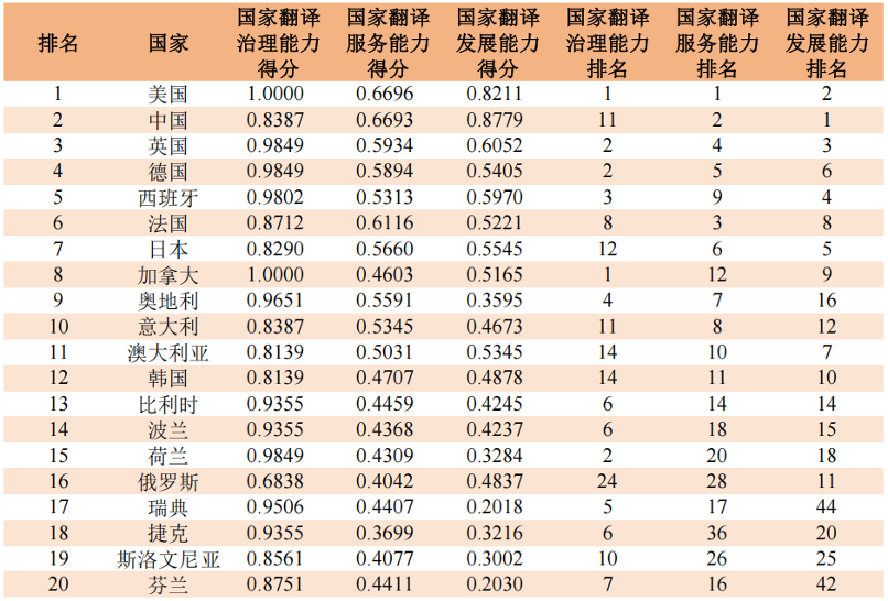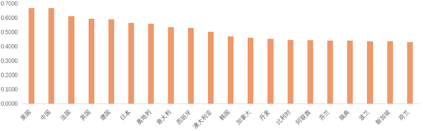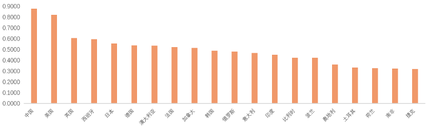 数据经过标准化处理后,采用自底向上的逐层递归加权方式测算指数,将各级指标得分分别加权求和,最终测算出各国的翻译能力综合得分及排名。具体排行情况如下图所示。