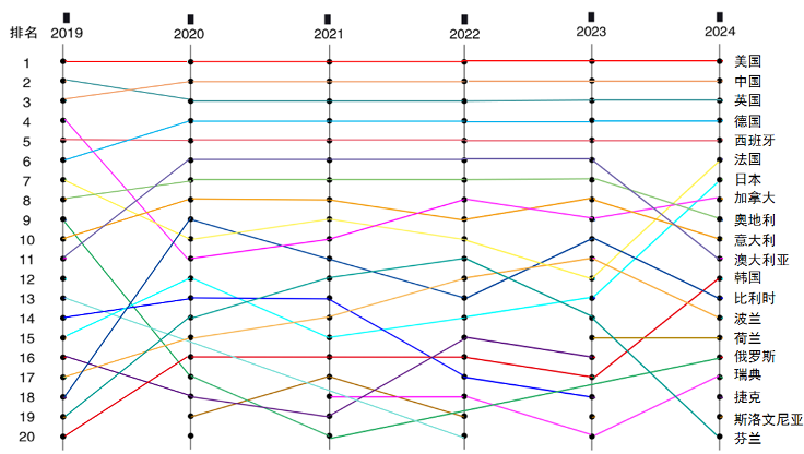 下面重点分析排名前20位的国家。下图显示了2019–2024年全球国家翻译能力指数排行榜前20名的国家排名变化情况。六年间,共有14个国家持续位列排行榜前20名。其中,美国、中国、英国稳居前三甲。美国始终位居榜首;从2020年开始,中国超越英国升至第二,英国则由第二退居第三。相较于2023年,2024年法国、日本、韩国等国家名次上升,澳大利亚、比利时、芬兰等国家名次下滑,俄罗斯、捷克、斯洛文尼亚进入排行榜前20,爱尔兰、瑞士、斯洛伐克跌出前20强。