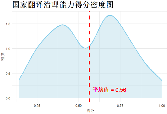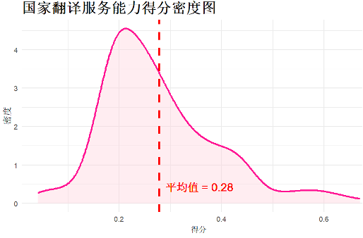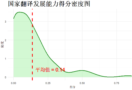 下面的得分密度图展示了2024年国家翻译能力三个一级指标所代表的分项能力得分分布情况。可以看出,多数国家在翻译分项能力方面发展不平衡,翻译治理能力得分普遍较高(M = 0.56),翻译服务能力得分次之(M = 0.28),翻译发展能力得分最低(M = 0.14)。