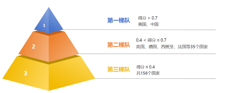 参照国家语言能力指数相关研究,我们根据2024年全球各国翻译能力得分情况,将全球国别翻译能力划分为三个梯队,如下图所示。第一梯队得分超过 0.7 分,包括美国、中国,这两个国家处于全球领先地位。第二梯队得分介于 0.4 分到 0.7 分之间,包括英国、德国、西班牙、法国等35个国家。第三梯队得分小于等于0.4 分,共156个国家。从三个梯队的划分可以看出全球国家翻译能力呈现金字塔式分布。