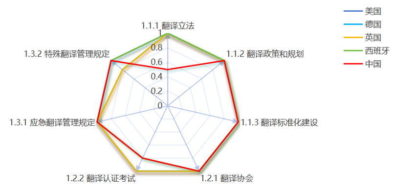 我们选取了国家翻译治理能力排名靠前,且整体国家翻译能力排名也靠前的几个代表性国家,包括美国、德国、英国、西班牙。下面的雷达图直观地呈现了中国与这四个国家在翻译治理能力下设的三级指标上的得分差异。