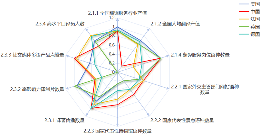 下面的雷达图直观地呈现了中国与排名靠前的美国、法国、英国、德国在翻译服务能力下设的三级指标上的得分差异。