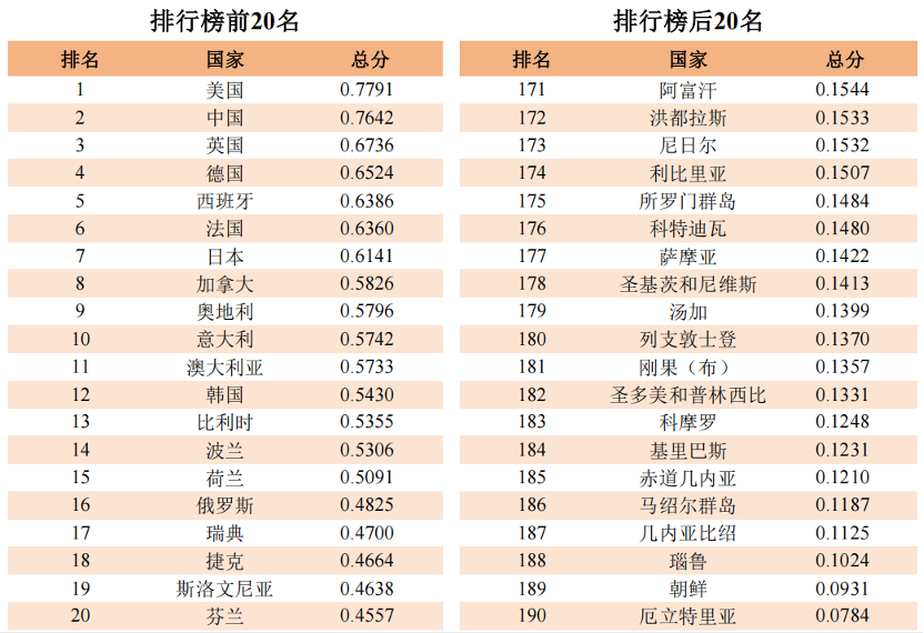 注:指数排行榜按照“得分相同,名次并列”的原则进行排名。193个国家中,有个别国家名次并列,因此最终有190个名次。