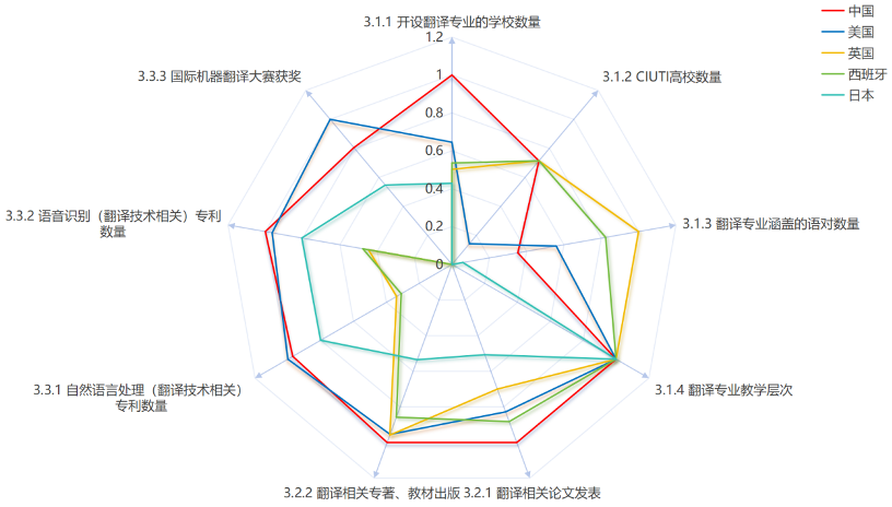 下面的雷达图直观地呈现了中国与排名靠前的美国、英国、西班牙、日本在翻译发展能力下设的三级指标上的得分差异。